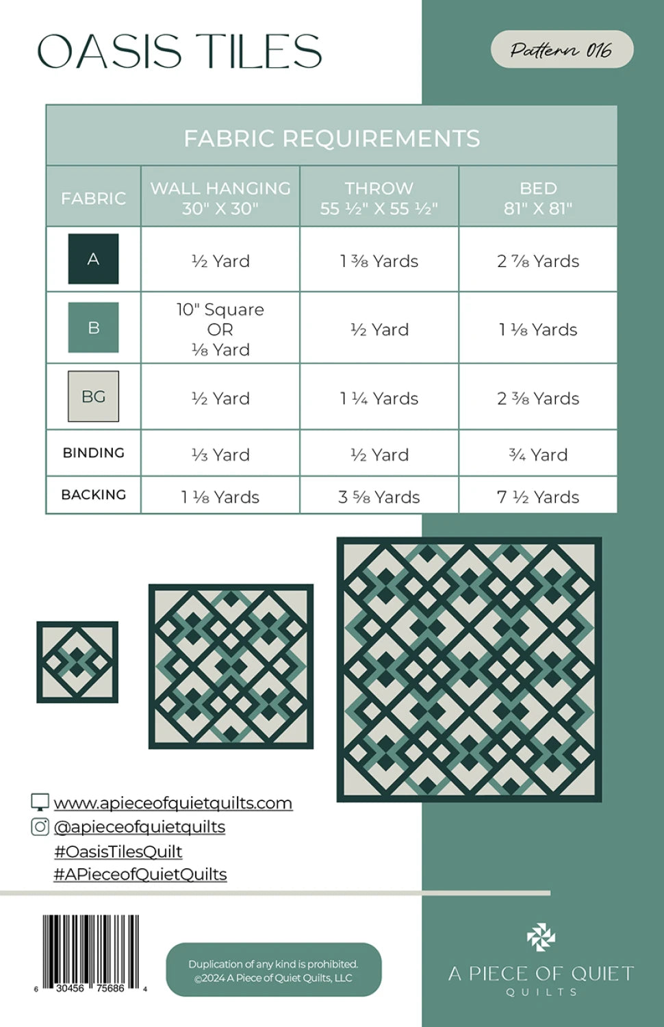 Oasis Tiles Quilt is inspired by the elegance of mosaic tilework, blending bold geometry with effortless flow. Designed for fat quarters, this confident beginner pattern makes it easy to mix and match prints while maintaining a structured, modern aesthetic. Whether you prefer a monochrome look, an ombré gradient, or a colorful collection of fabrics, Oasis Tiles offers endless creative possibilities. Available in square throw (60” x 60”) and large throw (72” x 84”) sizes, the pattern includes detailed diagrams, step-by-step instructions, and coloring sheets for easy planning. Bring artistry to your quilting with Oasis Tiles Quilt!
