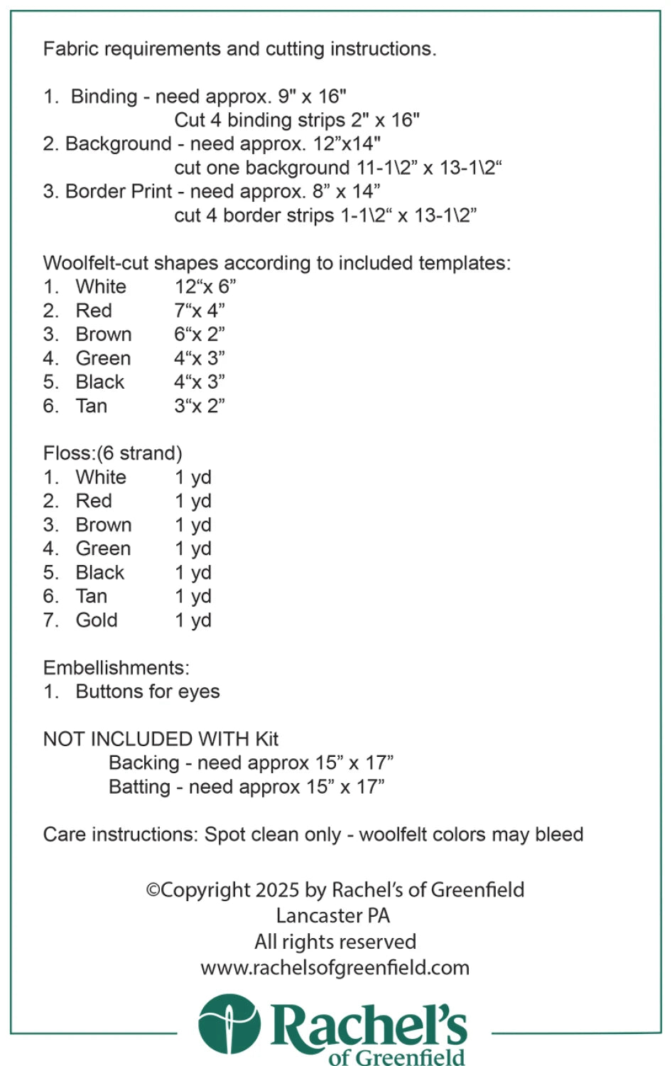 Snowman Kit includes all fabric, woolfelt, floss, pattern and templates needed to complete a 13” x 15” wall hanging top. The batting and backing are not included with this kit. The binding fabric is included. Snowman Wall Hanging Kit pictures snowman with elegant hat and red scarf alongside a birdhouse with holly and berries and four beautiful birds resting nearby. Colors are white, red, brown, green, and black.  The kit is not complicated.