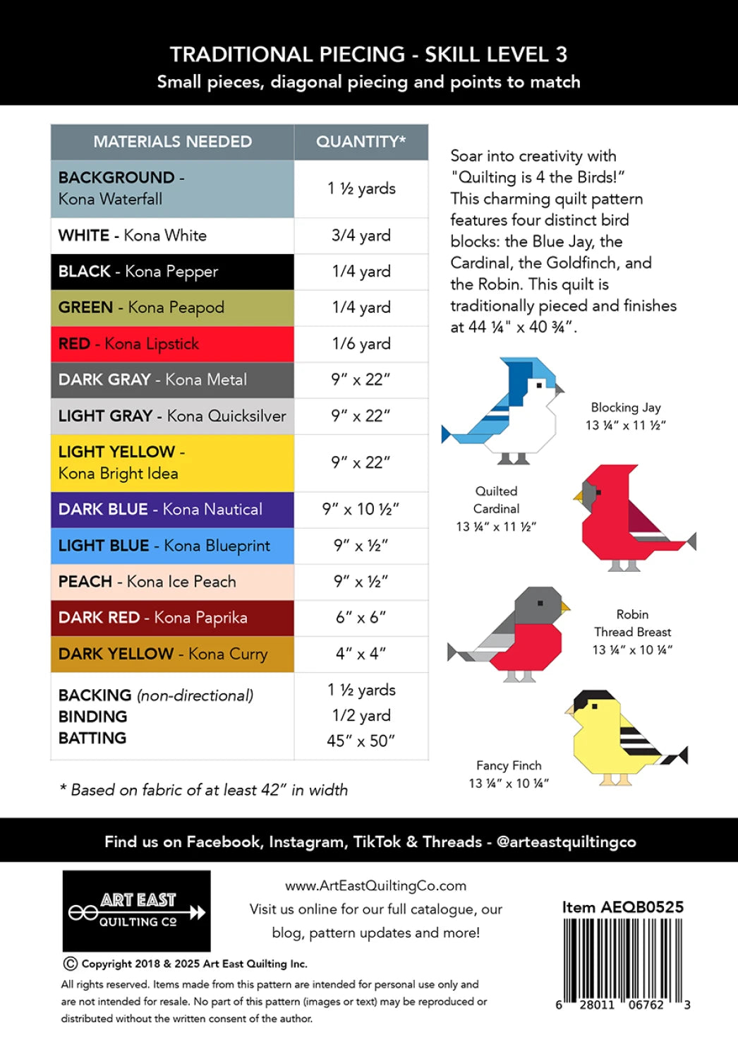 Grab your binoculars; it’s time to go bird watching! This pattern provides comprehensive instructions to create a delightful quilt measuring 44 ¼” x 40 ¾” (as depicted on the cover). Alternatively, you can use the individual block instructions to craft smaller, charming projects. The pattern includes detailed instructions for four unique bird-themed blocks: Blocking Jay (13 ¼” x 11 ½” finished) Quilted Cardinal (13 ¼” x 11 ½” finished) Fancy Finch (13 ¼” x 10 ¼” finished) Robin Thread Breast (13 ¼” x 10 ¼” finished) This pattern also guides you through the creation of the leaf border and sashing details, adding a cohesive and natural touch to your finished project.
