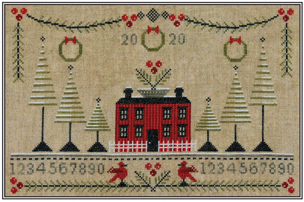 "A petite pinstripe house, a pair of red birds, pine boughs and a blanket of new-fallen snow, add charm to this winter scene. Simple numerals from 0-9 complete this festive miniature sampler in the count down to Christmas!