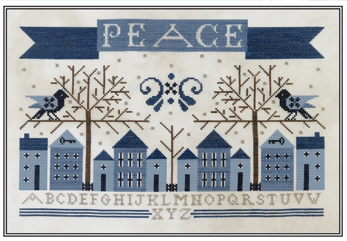 On a glorious mid-winter’s day, a pair of folkart birds rest in the branches of towering trees. Snowflakes silently begin to blanket this quaint village. Celebrate this Peace-filled season by stitching this sampler in soothing shades of blue. Winter’s Peace Sampler is sure to become a favorite wintry holiday display!