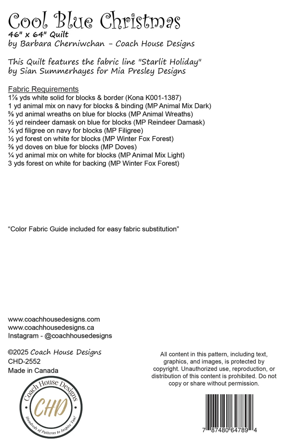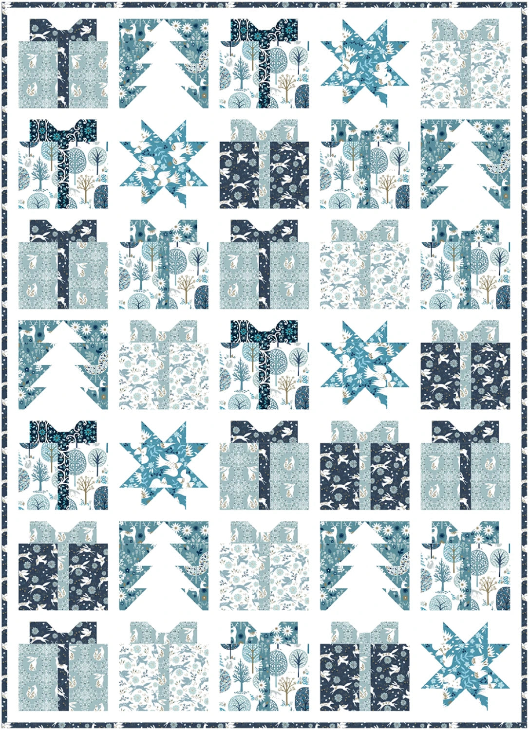 This 46" x 64" holiday quilt features Starlit Holiday by Sian Summerhayes for Mia Presley Designs. The quilt is made up of gift blocks, tree blocks and star blocks. The modern motifs and cool blues makes you think of ice sculptures, sleigh rides and hot chocolate on a cold and frosty winter night.