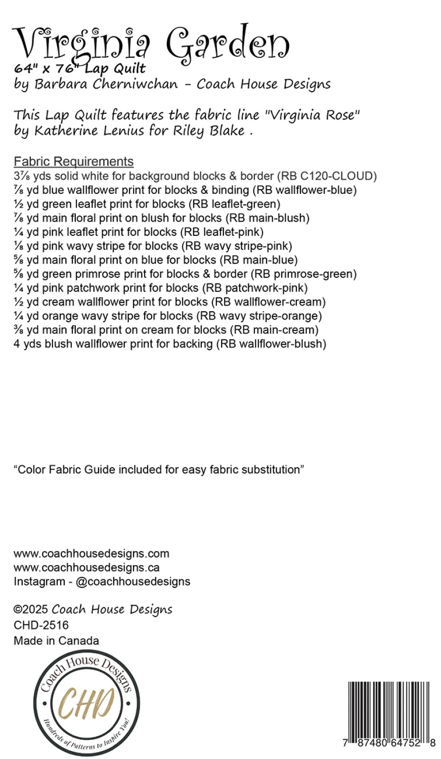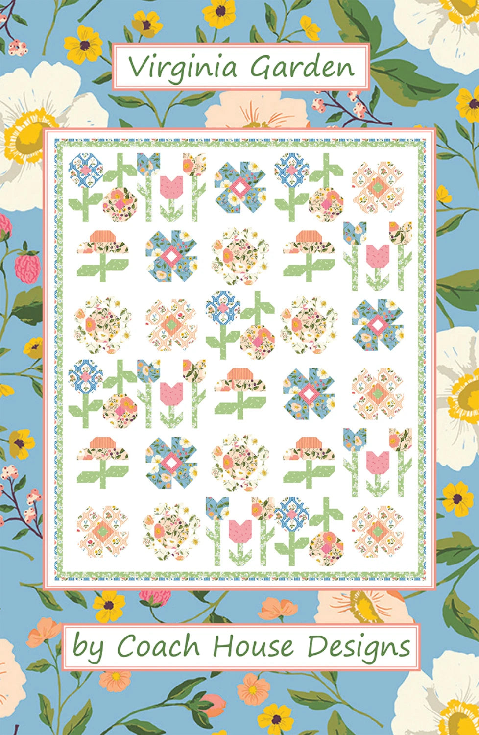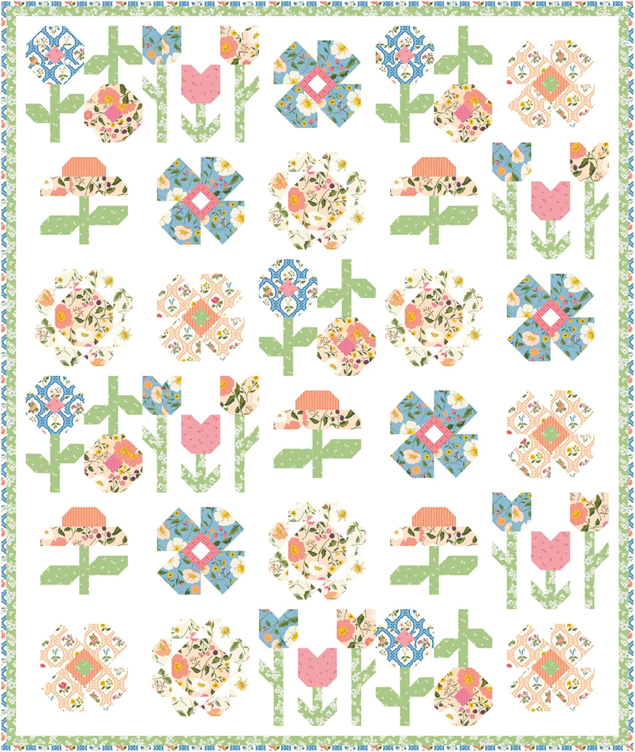 A floral quilt featuring Virginia Rose by Katherine Lenius for Riley Blake. Five different floral blocks are set in rows reminiscent of a wildflower garden in the English countryside.
