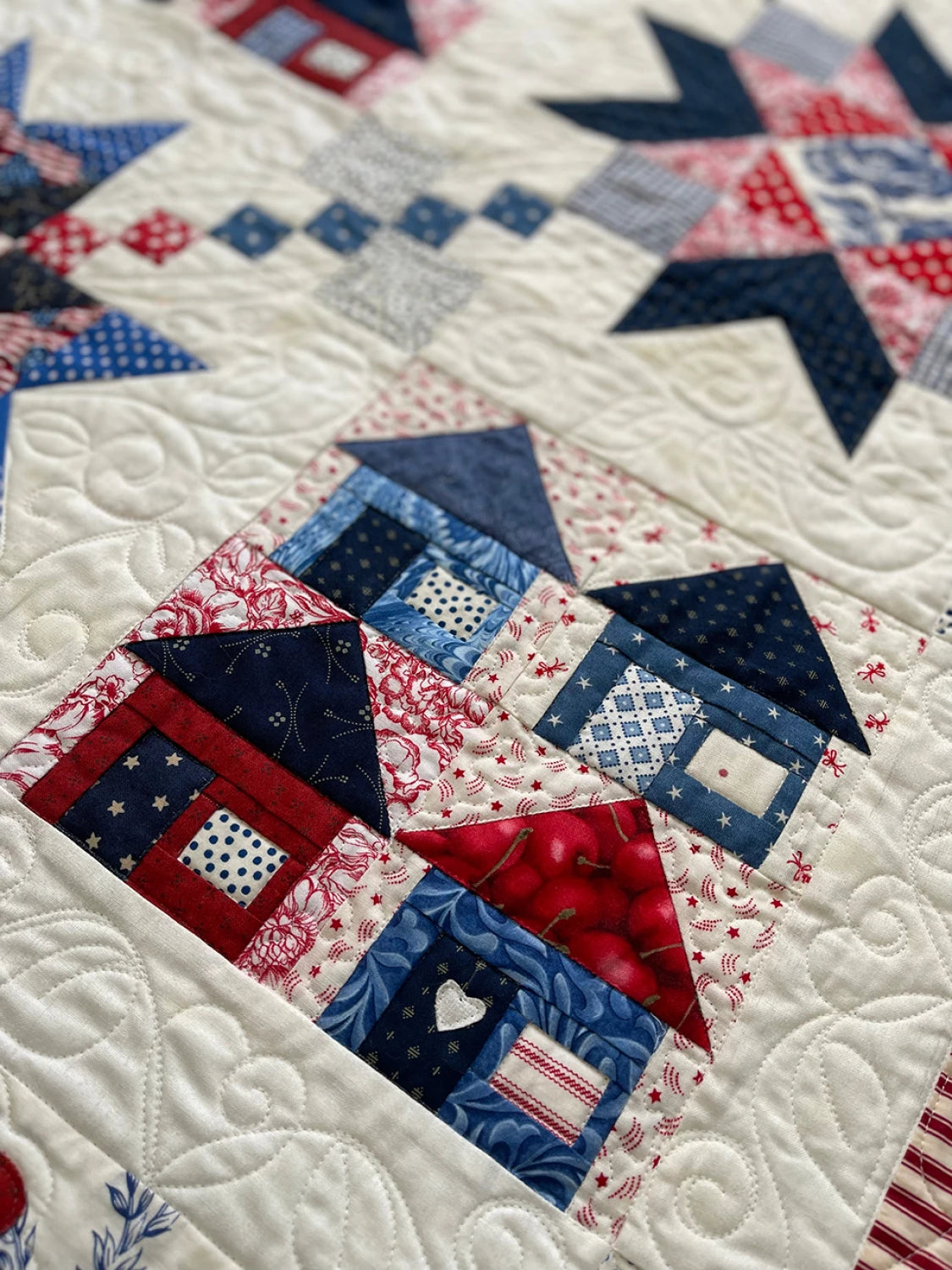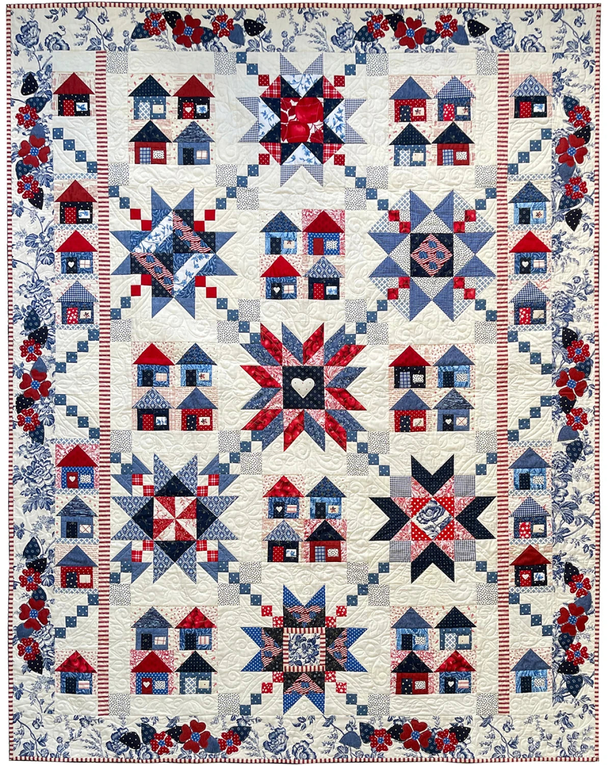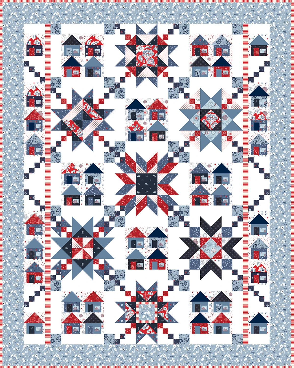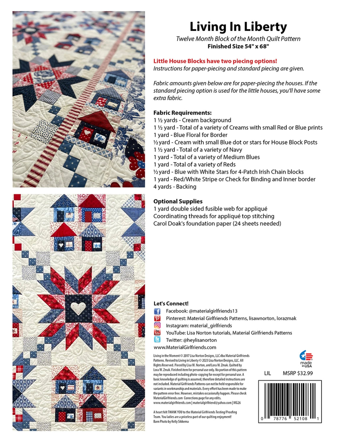Living in Liberty is a pattern written in a Block of the Month Quilt format.  The Finished Size is 54" x 68" Living in Liberty is a full Block of the Month pattern, with all blocks included in a single package. Designed to shine in a scrappy look, this quilt also looks stunning in coordinated red, white, and blue collections, or any favorite fabric line for a unique colorway.
