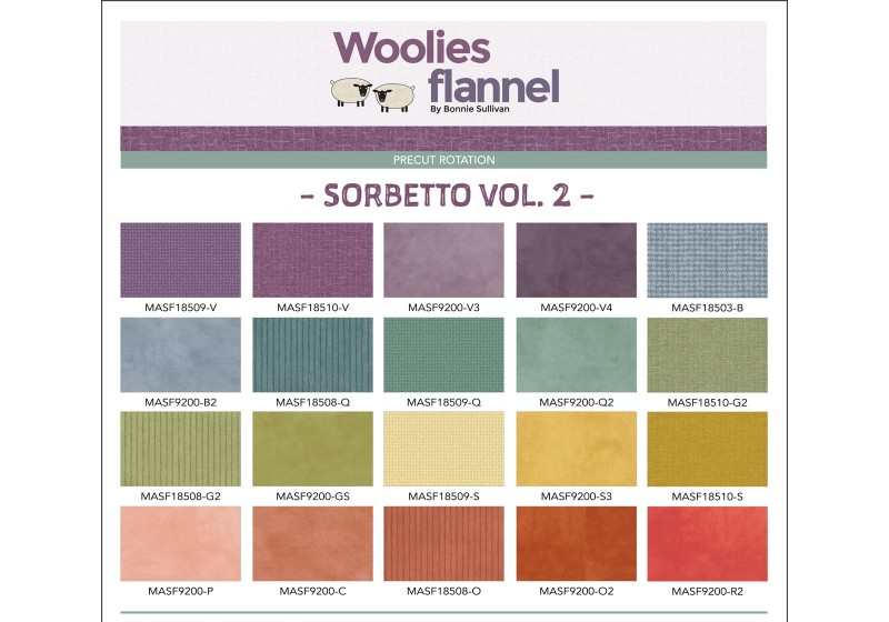 Sorbetto Vol. 2 Flannel Charms are designed by Bonnie Sullivan for Maywood Studios.