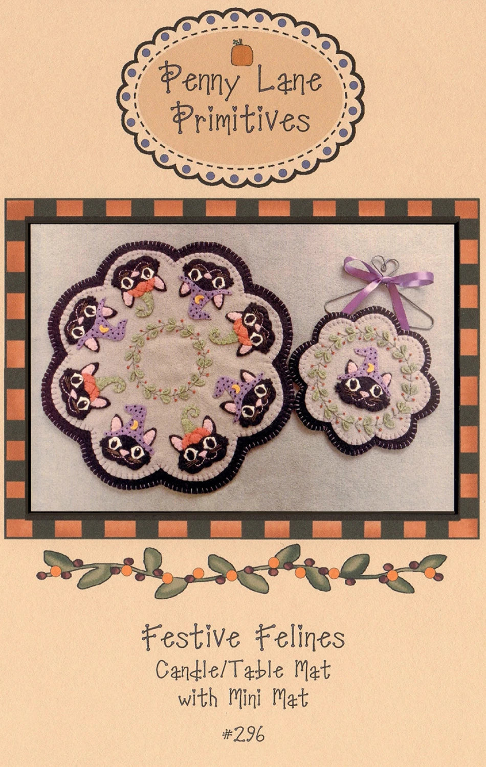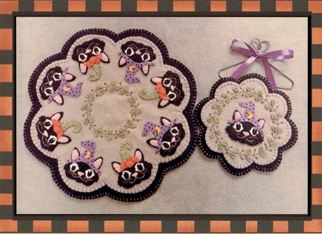 These adorable Halloween kitties are dressed in fun costumes and ready for Trick or Treating! The table mat measures 12 inch and the mini mat measures 7 inches. Stitch them up using wool felt or wool for a fun display in your Autumn home!