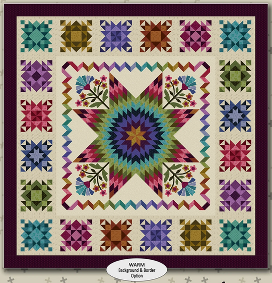 A vibrant Lone Star featuring Nancy's "Moody Hues" fabric collection by Andover Fabrics, is the focus of this medallion style quilt. Designed to span 10 months, Midnight Sparkle, showcases ten smaller blocks in a rainbow of colors and a charming zig zag border. The applique' can be done by hand or shops can order laser cut pre-fused applique kits directly from Nancy Rink Designs. And for those who want options, there is a "Cool" color way with two silvery background fabrics and a Midnight Blue outer border and a "warm" color way with two creamy background fabrics and a Mulberry outer border. The pattern is a soft cover, full color, booklet and includes full sized applique' templates. .