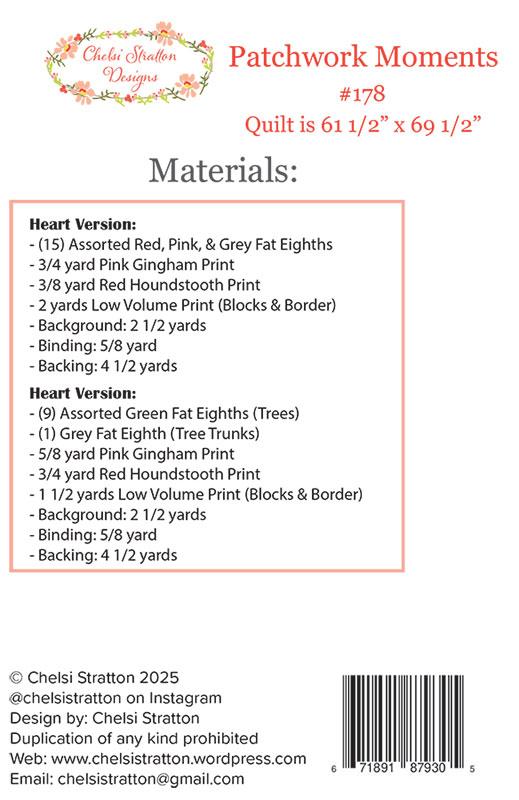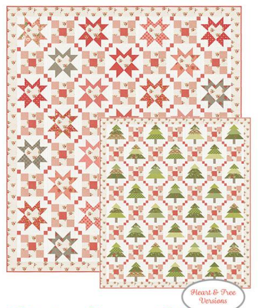 The Patchwork Moments quilt pattern features two different versions (hearts & trees) and measures 61 1/2" x 69 1/2". This pattern is the perfect example of how versatile Poinsettia and Pear is as a collection! The trees version is perfect for Fall and the holidays, while the hearts are so cute for Valentine's!