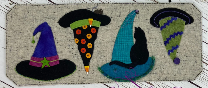 This whimsy hat runner has so much personality and are the fun pop of color you need for Halloween. Features wool applique and basic embroidery. Original design by Kim Zenk & Katie Hebblewhite of Granny's Legacy Patterns