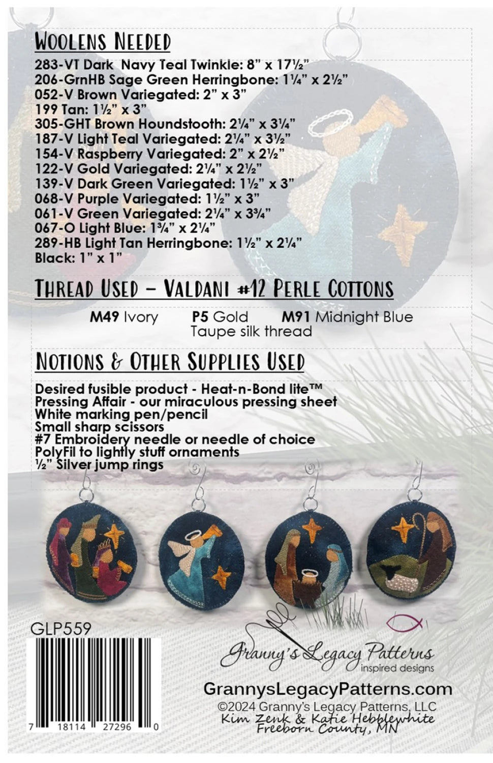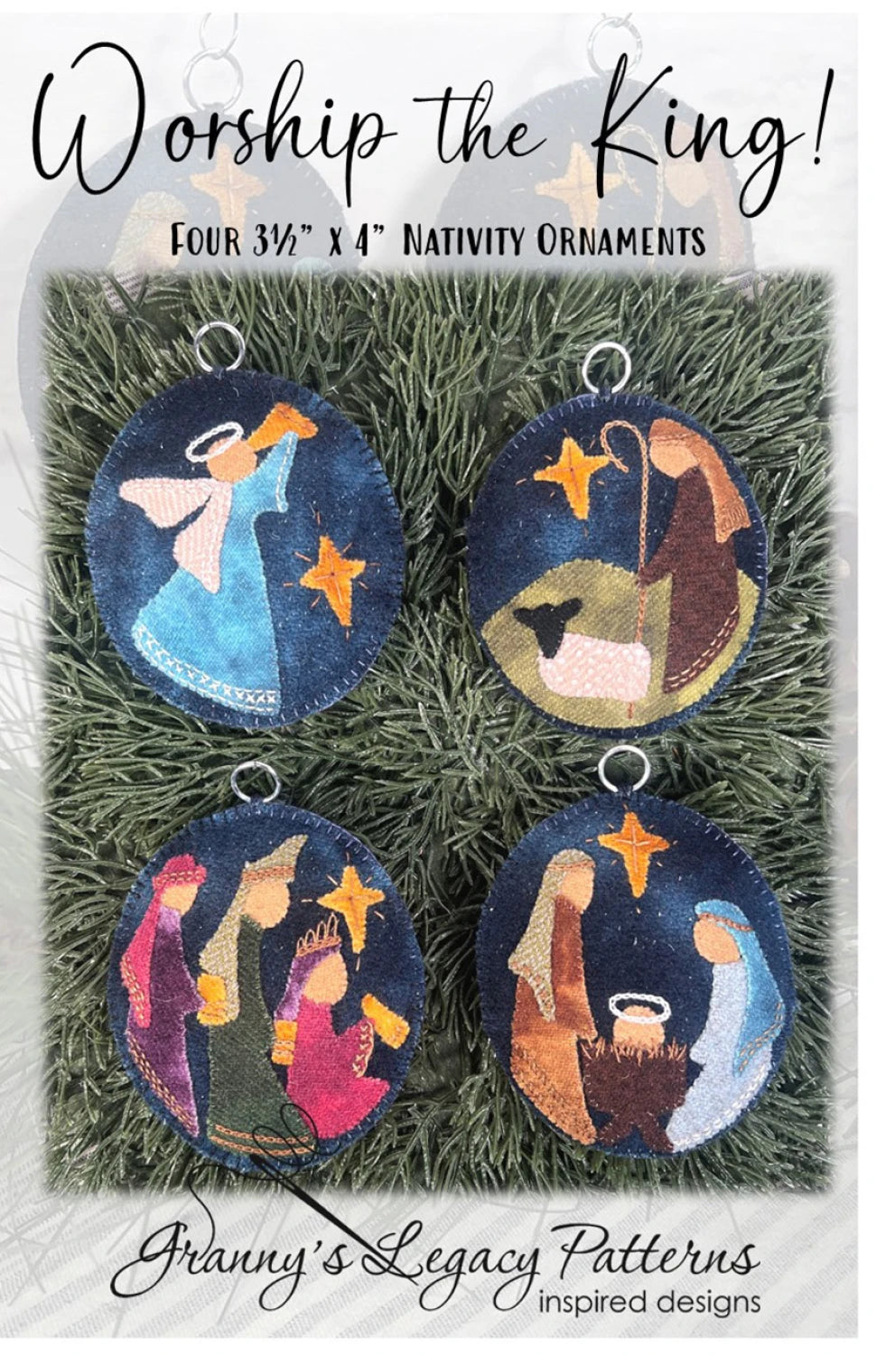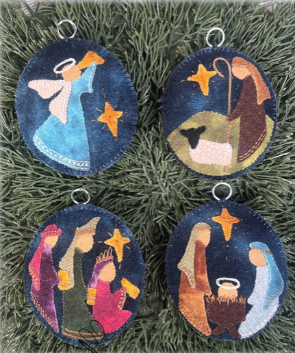 This beautiful set of 4 nativity ornaments is a perfect heirloom gift for someone special. Featuring stunning colors and simple embroidery, Worship the King is suitable for the experienced beginner, through advanced stitcher. Techniques used: wool applique, Valdani Perle cotton embroidery thread, and silk thread applique.