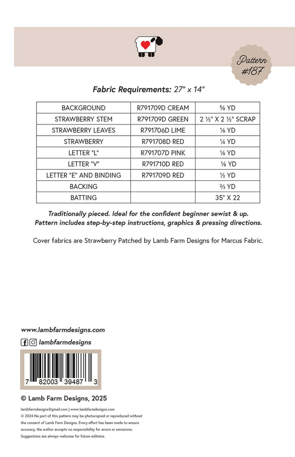 Berry Much is a sweet and cheerful quilt pattern measuring 28" x 13", perfect as a wall hanging or table topper. Designed for confident beginners, this traditionally pieced project spells out the word "LOVE" with a charming strawberry block as the O, adding a playful, heartfelt touch. The design is finished with a delightful, pieced border made from an assortment of flying geese, bringing movement and whimsy to this small but impactful quilt that's ideal for gifting or seasonal décor.