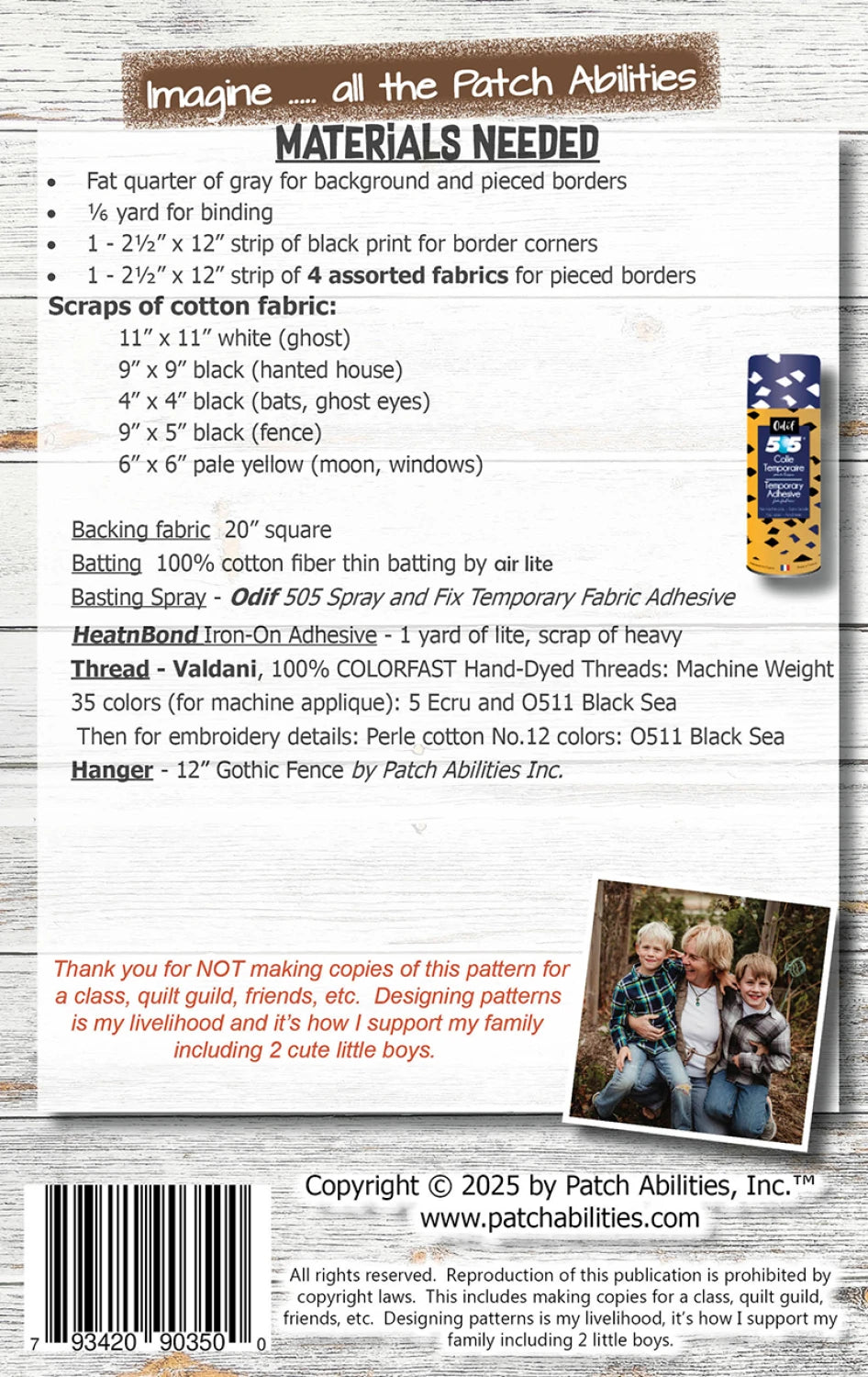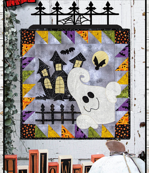 "October in Monthly Minis series 16, this block of the month pattern series offers a beginner friendly combination of applique and piecing. A Halloween haunted house on a full moon, a few friendly bats and a photo-bombing ghost are made easy using traditional raw edge applique with fusible web. This 6"" x 9"" pattern offers a block of the month stand alone wall hanging quilt measuring 16.5"" square. Hangs easily with a 12 inch hanger shown.