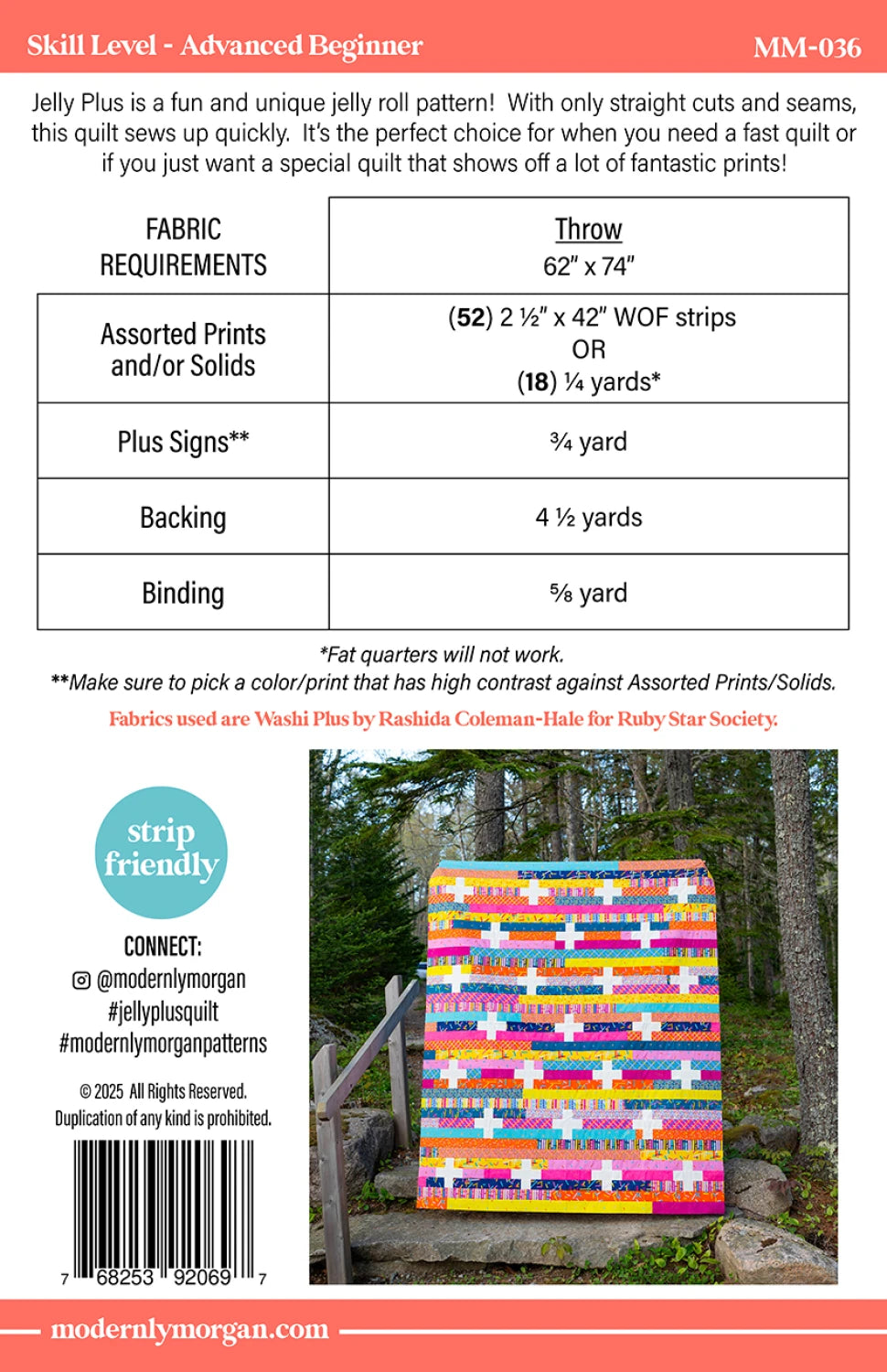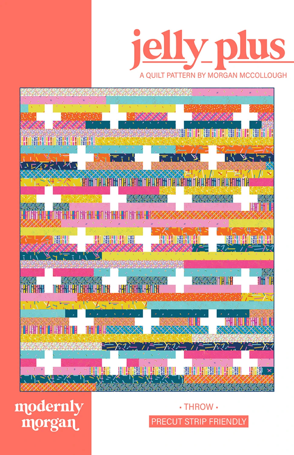 Jelly Plus is a fun and unique jelly roll pattern! With only straight cuts and seams, this quilt sews up quickly. It’s the perfect choice for when you need a fast quilt or if you just want a special quilt that shows off a lot of fantastic prints! Finished size is 62" x 74".