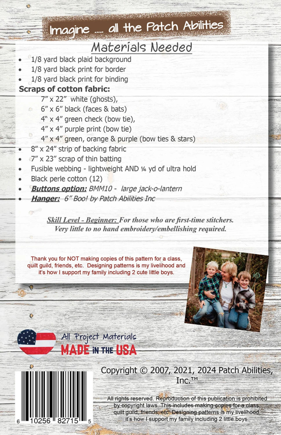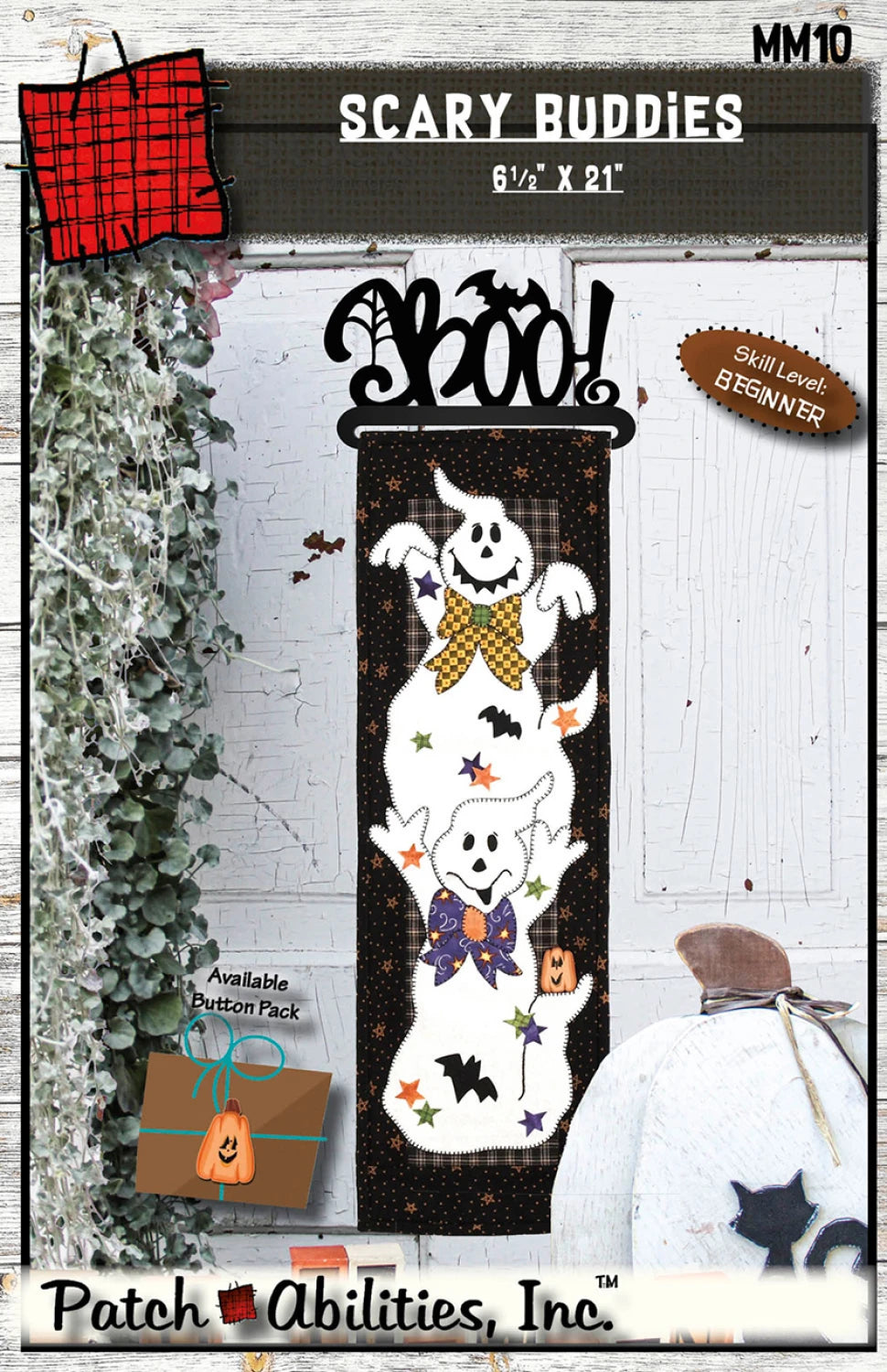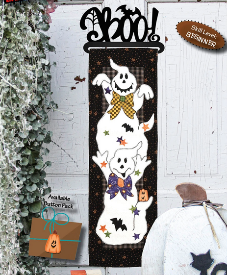 Features a Jack-o-Lantern button by JABC. Great Halloween wall hanging design featuring two happy ghost friends! Pattern features: beginner friendly, fusible web applique, includes embroidery stitch guides, beginner tips and binding instructions. Very little to no hand embroidery/embellishing required. This can be completed in one day! Skill Level: Easy, Beginner friendly machine applique. This pattern is part of a series! See #PMM01-#PMM12 for other monthly designs.