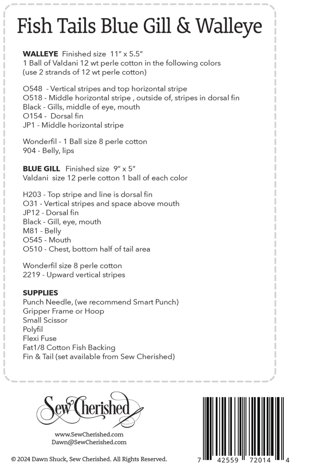 Our Fish Tails collection would not be complete without a Walleye or Blue Gil. These little guys make the perfect and unique gift for the fisherman in your life. With a punched body and wooden fins and tail they will be really cute hanging from a stringer or can also be used as bowl fillers as well. Finished Walleye measures 11" from now to tip of tail. Finished Blue Gil measures 9" from nose to tail. Fish bodies preprinted on weavers cloth already included in pattern. Fins and tails sold separately.