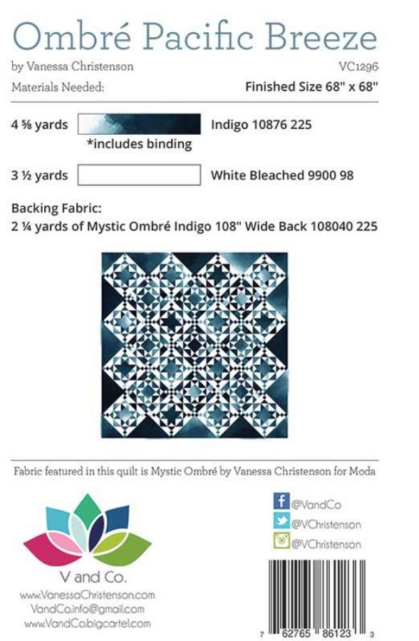 This pattern uses V and Co Mystic Ombre fabric for Moda. It features step-by-step instructions with color illustrations, pictures and diagrams.
