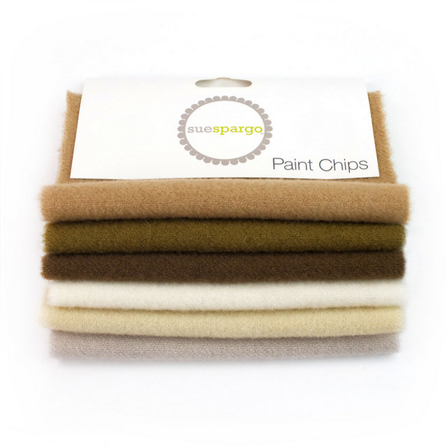 Sue Spargo wools are milled in the United States and hand dyed in our Ohio studio. Our custom milled base is a hefty 13 oz, 100% wool, ideal for achieving dimensional appliqué. Fray resistant and featuring an ultra-soft hand, we painstakingly hand dye every batch to fully saturate it with color. Paint Chips are ideal stash builders and perfectly sized for appliqué!